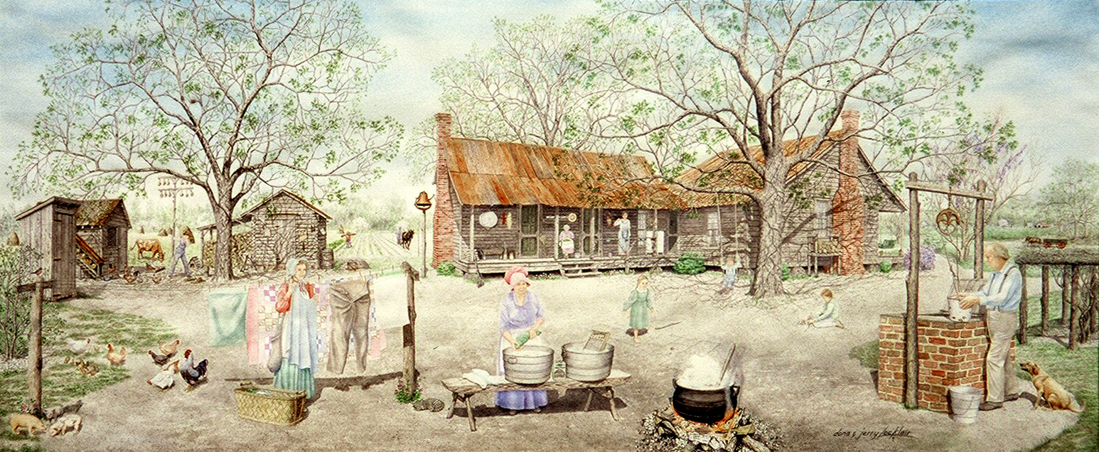 Washday has been a routine activity worldwide ever since clothes have been worn. Before electricity, most people washed their clothes in their backyards. Washing clothes was a laborious job requiring family participation. They drew water from a well or pumped it with a hand pump to fill the tubs used for scrubbing and rinsing their clothes. Home-made lye soap and 20 Mule Team Borax were their detergents. The family used big black iron wash pots in which to boil their clothes. The outside activities surrounding this old house are truly memorable ones of "Washday". |